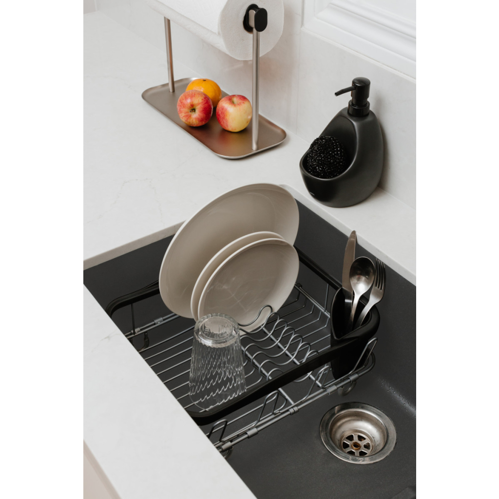 Umbra Sinkin je praktický odkapávač, který se pohodlně vejde přímo do vašeho dřezu a udržuje kuchyňský prostor čistý a uspořádaný. Díky kombinaci kovového rámu a odolného polypropylenu je stabilní a dlouhodobě vydrží. Protiskluzové nožičky chrání povrch dřezu a vyjímatelný košík na příbory si můžete přizpůsobit podle potřeby. Sinkin lze použít nejen uvnitř, ale i mimo dřez, a je kompatibilní s většinou typů kuchyňských dřezů.