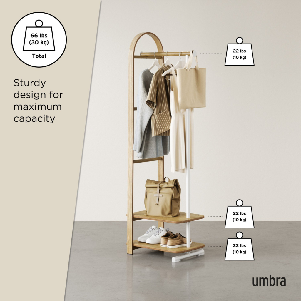 Umbra Bellwood Coat Rack spojuje moderní design a praktickou funkčnost v jednom. Díky typickým zaobleným liniím a dřevěným akcentům z kolekce Bellwood se stane stylovým doplňkem každého interiéru. Tento všestranný stojan poskytuje dostatek prostoru pro kabáty, tašky i doplňky, zatímco spodní police nabízí místo na boty či úložné boxy. Dva integrované háčky po stranách dodávají ještě více prostoru pro zavěšení čepic, šál nebo kabelek. Ideální do předsíně, ložnice i šatny.